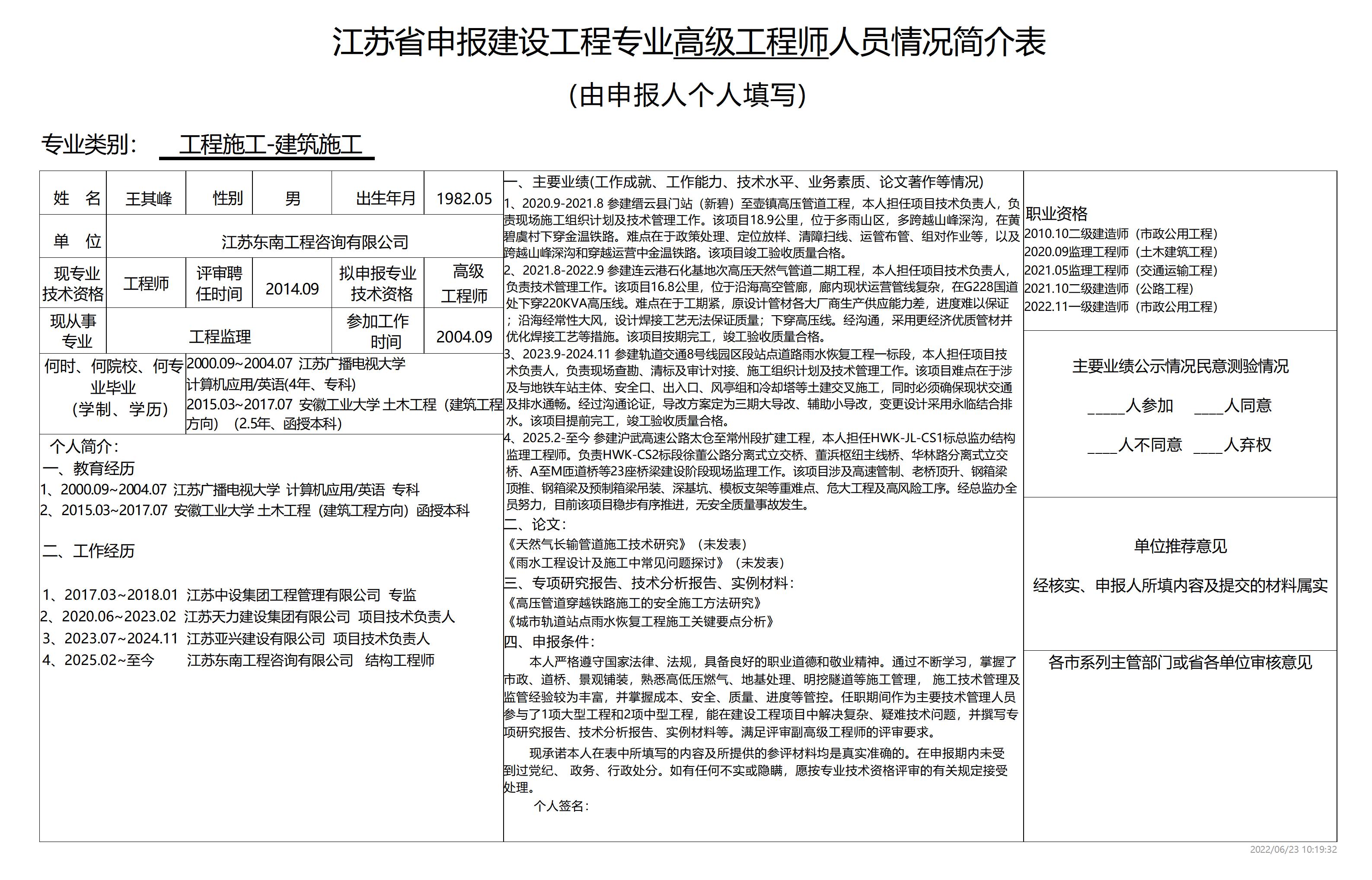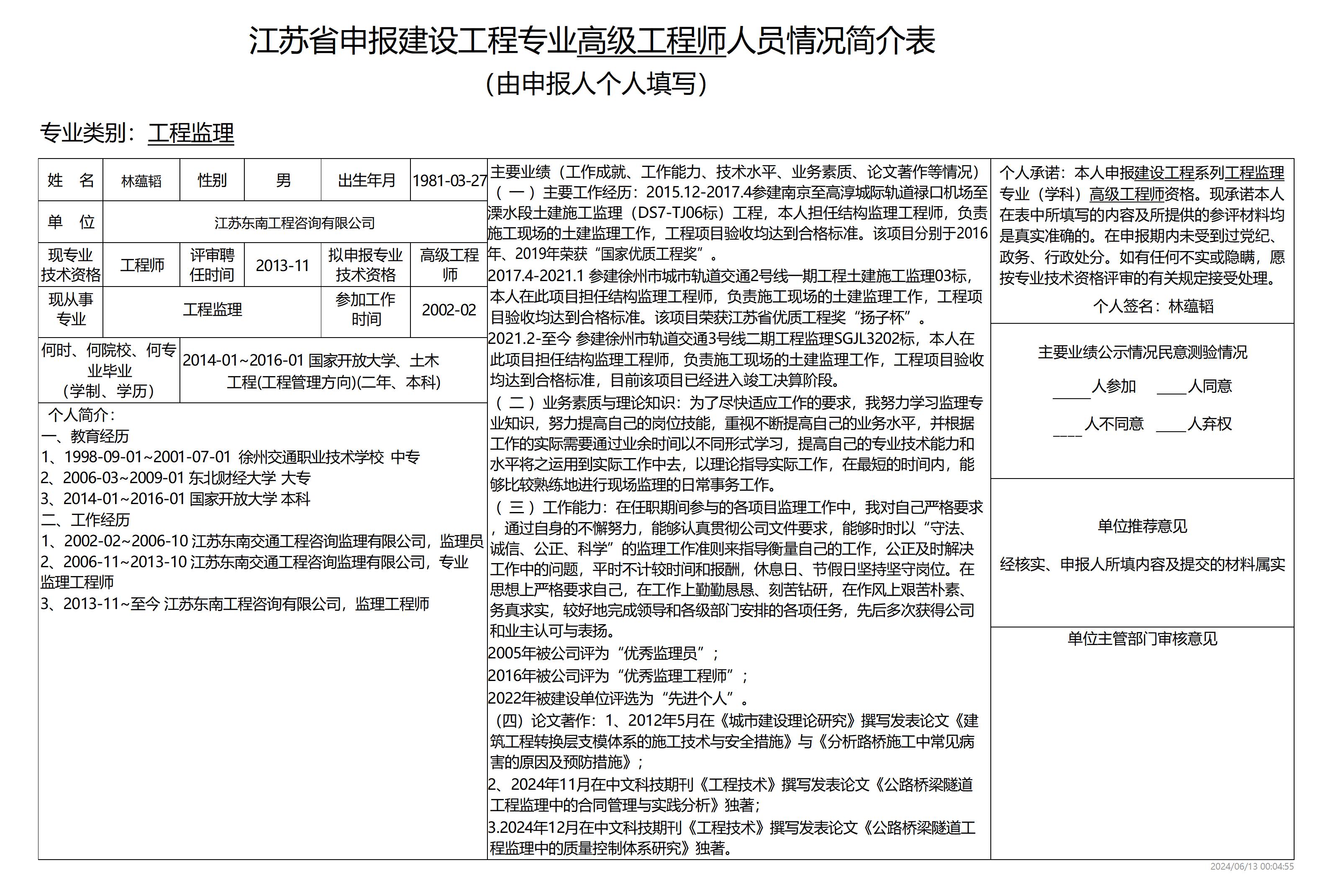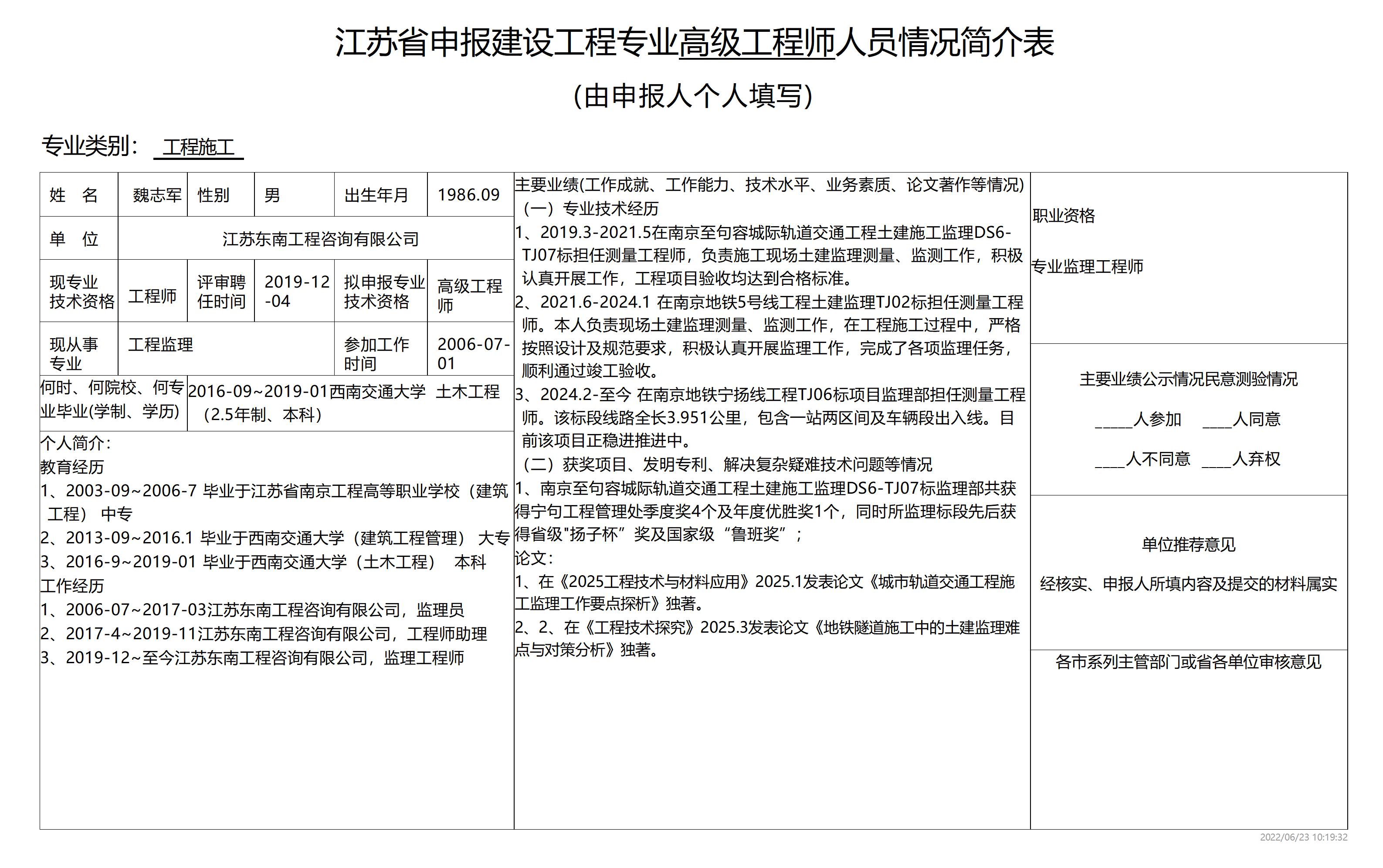 根據《江蘇省建設工程專業技術資格條件(試行)》規定,2025年度有林蘊韜等11名同志擬申報江蘇省住房和城鄉建設廳建設工程專業高級工程師。為體現公開、公平、公正原則,廣泛聽取群眾意見,現將擬申報人員信息予以公示。