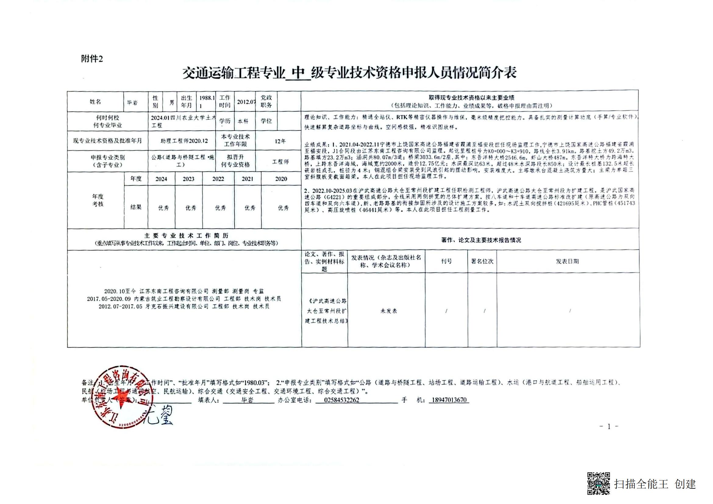 畢巖 性別:男;1988年11月05日出生,2012年7月畢業于內蒙古交通職業技術學院建筑工程技術專業,大專畢業。2024年1月畢業于讀于四川農業大學土木工程專業,本科畢業。2020年12月至今聘任助理工程師資格。繼續教育學時滿足申報高一級職稱要求。現任江蘇東南咨詢有限公司測量崗專監一職。