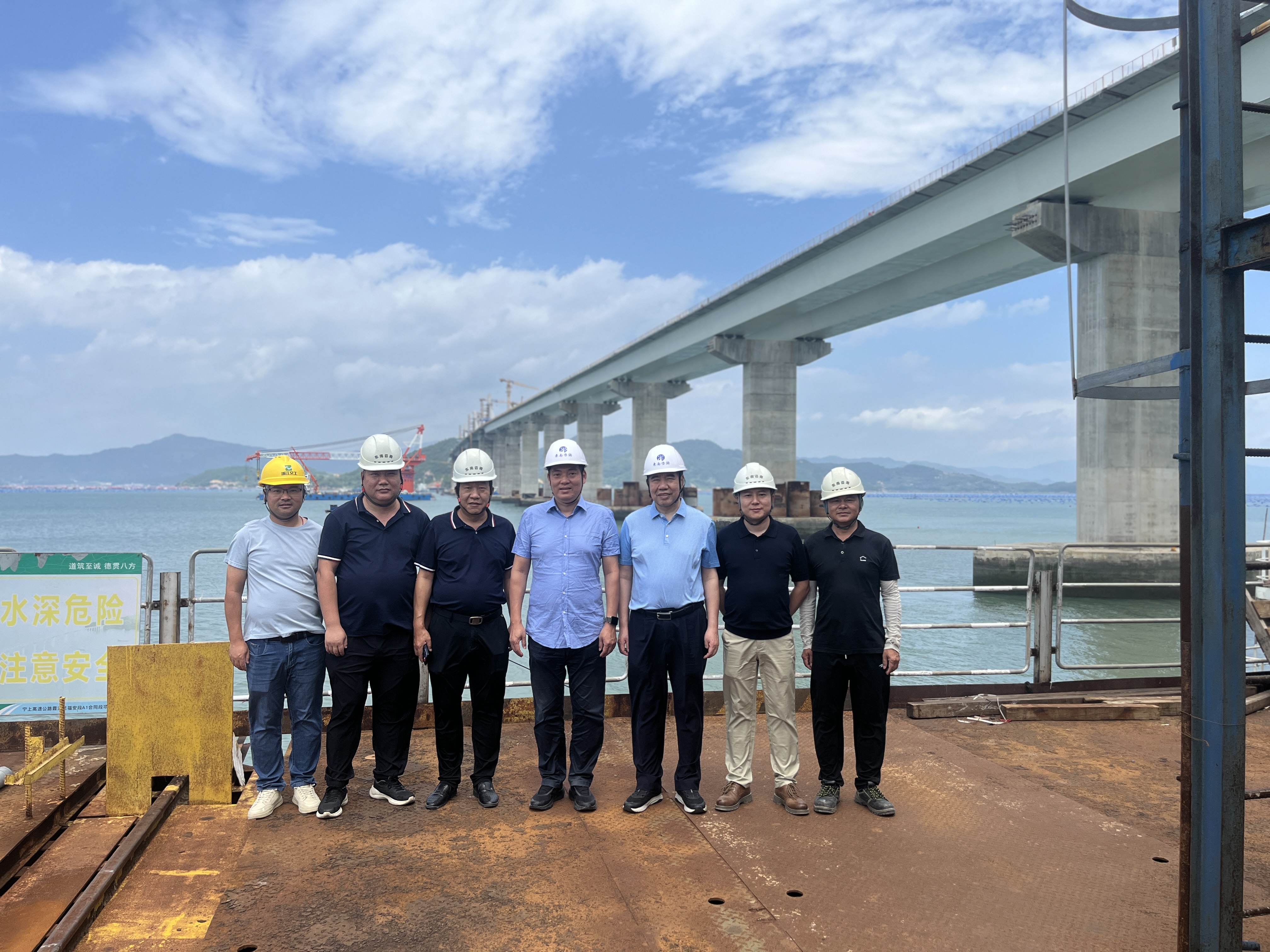 尤鋆一行頂著烈日,實地查看了廈門沈海高速杏林互通及接線項目的田李溪大橋、主線高架橋以及寧上高速J1合同段東吾洋特大橋等重點施工部位,詳細詢問了工程實施及安全生產情況,特別叮囑團隊要做好高溫和臺風季節的工作安排,強調要科學調整作息。